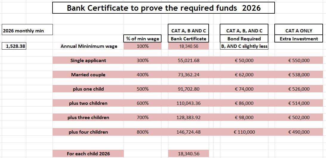 - Show proof of sufficient means to support yourself and family. This is currently proven by bank certificate of 300% of the minimum salary and 100% additional for each dependent, this involves opening a local account and depositing the required funds currently (From January 2025) € 52,092.00 and € 17,364.00 for each dependent (including ALL children regardless of age). You are not required under this category or any other category to prove the actual source of income to Immigration. This will become clearer to you as preparations continue.